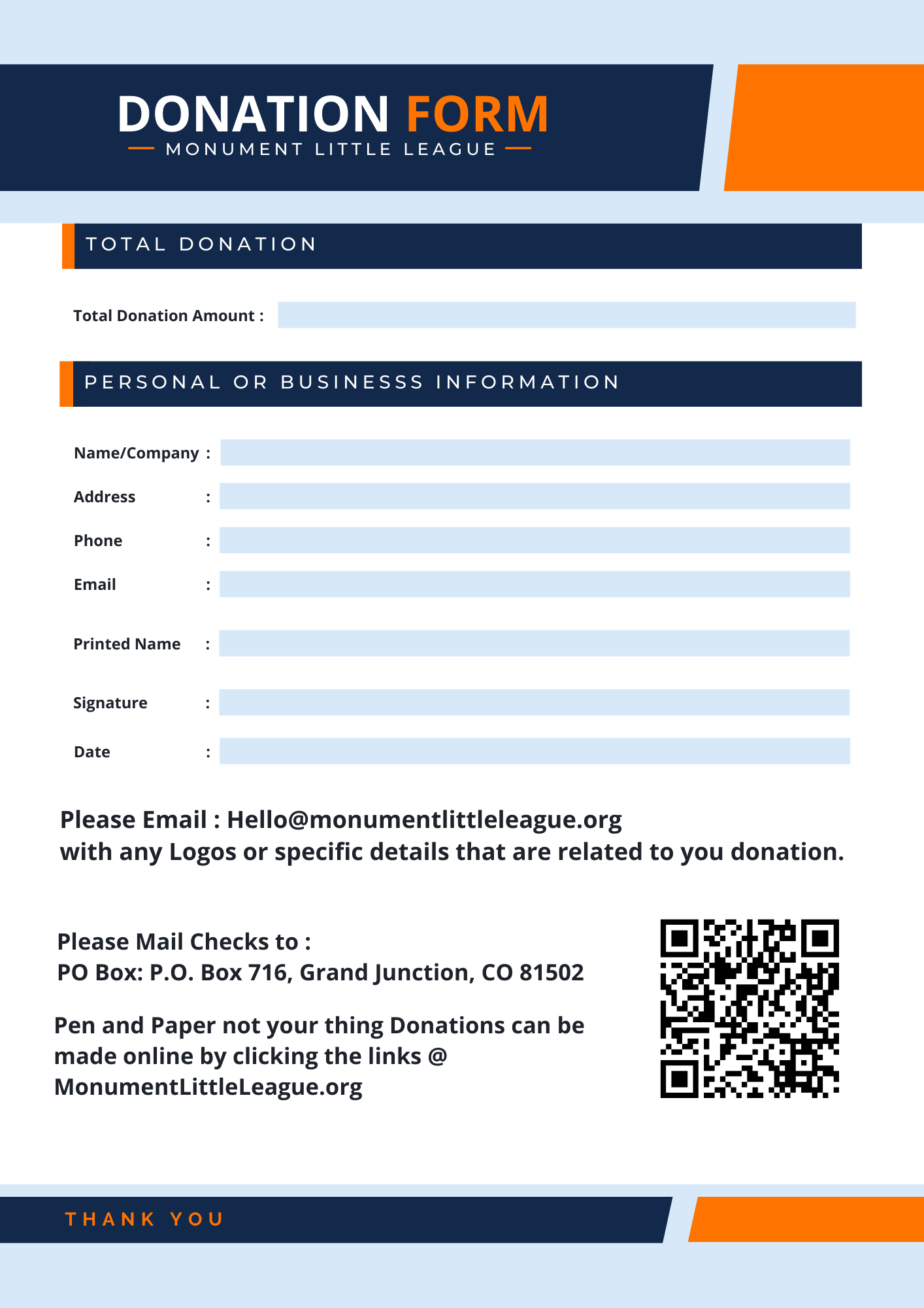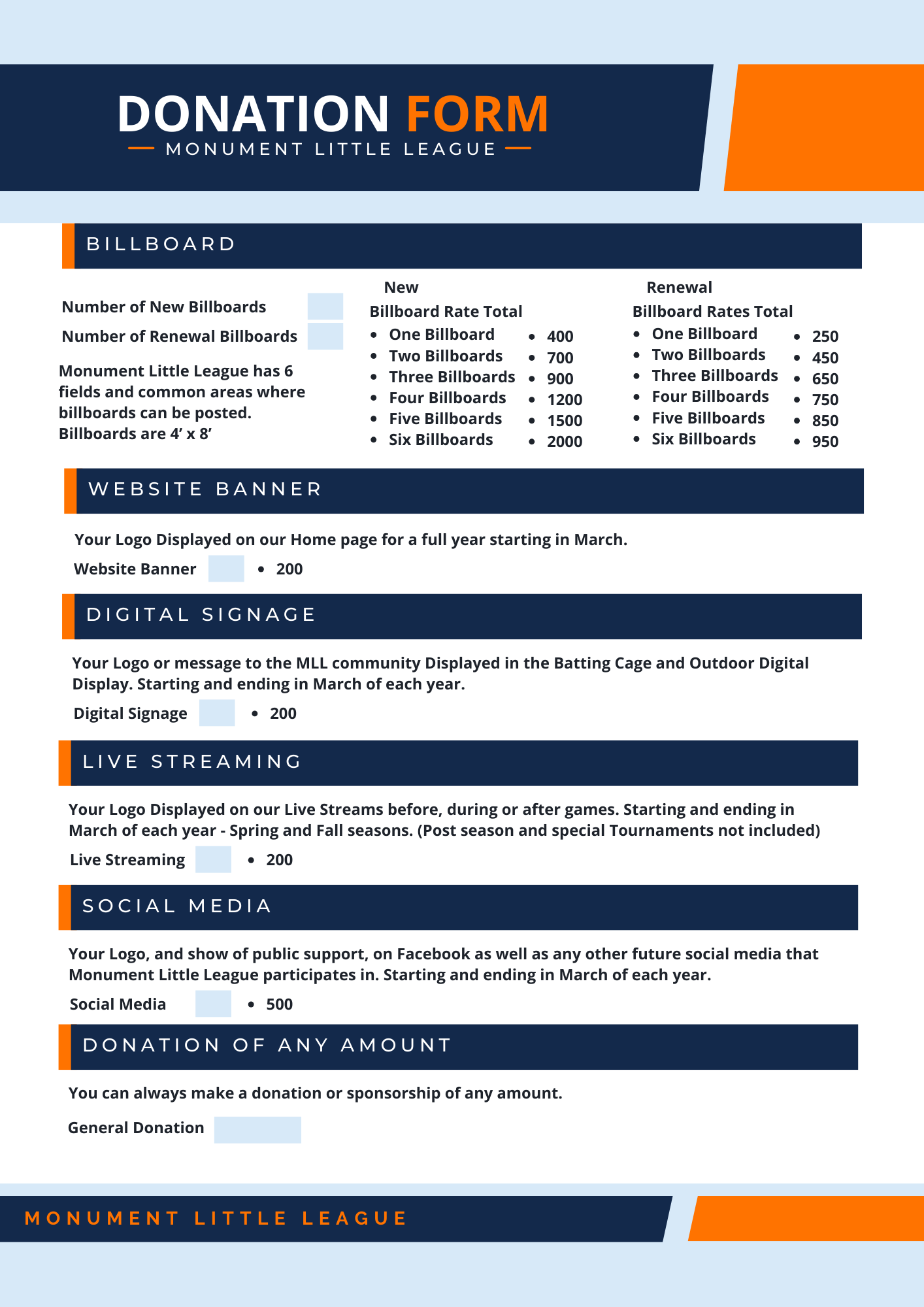 Monument Little League is a nonprofit organization that relies on it volunteers. It is fully funded through registration, facility rentals and sponsorships. Please see the flyer below for more details.